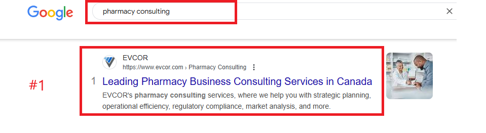 Keyword ranking at #1 "pharmacy consulting"