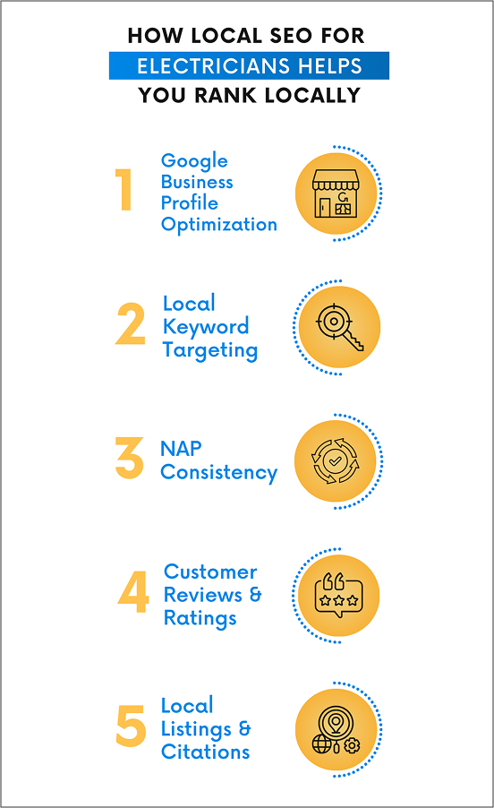 For electricians, most business comes from customers within a specific service area. This makes local SEO for electricians a crucial component of any digital marketing strategy. When optimized correctly, local SEO ensures that your business appears in searches such as “electrician near me”.